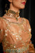 Celebrate your Mehendi in radiant style with this stunning golden outfit, crafted to capture the spirit of festivity and tradition. The flowing silhouette is adorned with intricate hand embroidery in gold and hints of red and green, symbolizing joy and celebration. Designed in rich net and silk fabrics, it features a high neckline, sheer sleeves, and a flared skirt that moves gracefully with every step. The look is completed with a touch of regal charm, perfect for a bride who desires elegance and splendor on her special day.