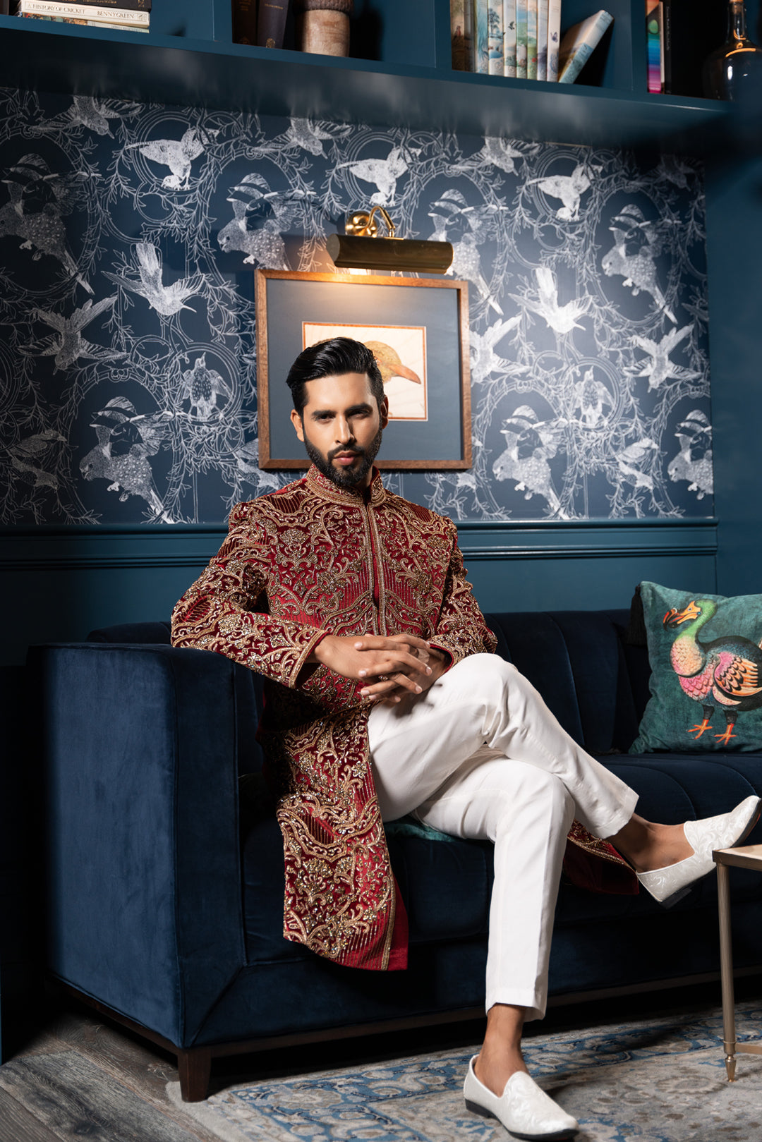The kameez is equally breathtaking, with heavy embroidery along the neckline, sleeves, and bottom, accentuated with zardozi and mukesh work, making every detail shimmer. The kameez is further adorned with scattered motifs all over, which adds to its rich, festive appeal. The deep maroon color of the outfit is complemented by intricate embroidery in both antique gold and silver, making the design timeless and elegant.